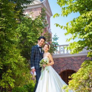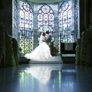 純白の大聖堂・緑あふれるナチュラルガーデン・5面のステンドグラスとレンガ造りの建物等